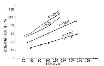 超臨界轉(zhuǎn)速運轉(zhuǎn)不僅在理論上突破了公式(2-5)的局限性,而且可以提高磨機的處理能力。生產(chǎn)實踐指出,如果應用恰當,超臨界轉(zhuǎn)速運轉(zhuǎn)可以提高磨機的生產(chǎn)力,雖然功率耗相應地增加,但比功率耗(即千瓦·時/噸)常常是降低的,如下表中的例子。磨機的轉(zhuǎn)速和裝球量是影響磨機生產(chǎn)率的兩個關鍵性的因素。超過nc值運轉(zhuǎn)固然可以提高磨機生產(chǎn)率,但要求減少裝球量,而減少裝球量又會使生產(chǎn)率降低。所以不能片面地采用大幅度提高轉(zhuǎn)速及大幅度減少裝球量的辦法,這反而會使生產(chǎn)率下降,如下圖3-2-6反映的情況。當裝球率減少到25%以下,即使將轉(zhuǎn)速率提高到145%,生產(chǎn)率也達不到裝球率為35~40%,(轉(zhuǎn)速率為110~120%的。并且轉(zhuǎn)速太高,磨機振動很厲害,也會造成危險。