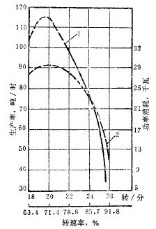 于71~75%范圍內(nèi)磨機的處理能力更高,轉速率低于或高于這個范圍時處理能力便趨于降低。磨機輸入功率與轉速率的關系和生產(chǎn)率與轉速率的關系相似,按磨碎每噸產(chǎn)品的動力消耗計,則一般隨轉速率降低而減少。