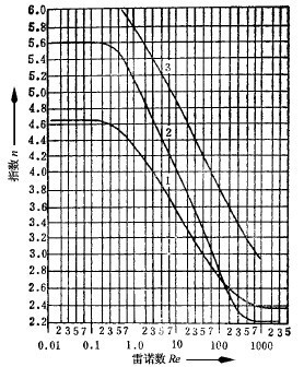 按摩爾朗德(Moreland)等的研究,n值還與雷諾數有關,其關系示于圖1中。雷諾數按計,v0為自由沉降末速度。