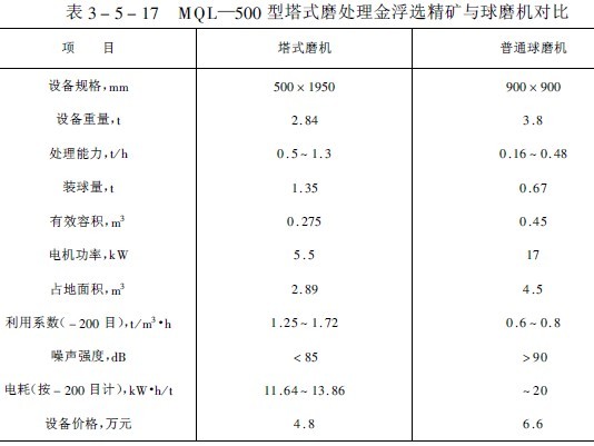 我國有關單位研制的MQL——500型螺旋攪拌塔式磨機也分干式、濕式兩種。濕式塔式磨機于1984年在大石河鐵礦選礦廠進行過半工業試驗,后來在金廠裕金礦用作浮選金礦的再磨,以滿足該廠下步氰化浸出的要求。該廠采用一段塔式磨機可以將小于350目占64%的金浮選精礦磨細到小于350目占99.74%,磨機利用系數為0.485噸/米3時,電能消耗為13.45千瓦/噸,鋼耗為4.65千克/噸,MQL——500型塔式磨機與球磨機工業試驗指標列于表3-5-17中。