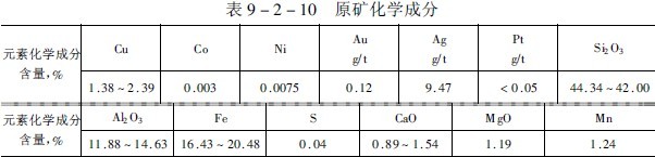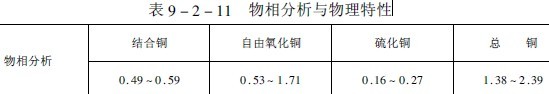 該礦屬于石英閃長(zhǎng)斑巖與石灰系灰?guī)r接觸交代矽卡巖銅礦床。礦石呈土狀,氧化程度較深。由于成巖階段次生富集作用,銅液擴(kuò)散推移過程中與硅、鐵和鋁的鹽類及其氧化物形成結(jié)合性氧化銅,覆蓋于表面及間夾于孔雀石類型礦石中。含銅礦物以孔雀石為主,有少量藍(lán)銅礦、硅孔雀石和水膽礬等。鐵的礦石主要為褐鐵礦,磁鐵礦和亦鐵礦次之。脈石除鐵質(zhì)粘土外,還有石英、云母、石榴子石、角閃石、蛇紋石、綠泥石和方解石等。原礦中鐵質(zhì)粘土含量很高,-200目高達(dá)48%,礦石含水27.1%,較大塊的礦石300毫米左右。原礦物質(zhì)組成列于表9-2-10和表9-2-11。