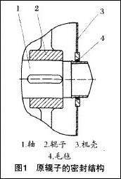 該型破碎機的輥子與機殼間的密封過去采用毛氈密封,其結構見圖1。毛氈對空氣的密封效果不好,環境干燥,使用不久毛氈就會磨損,造成嚴重的漏灰現象。