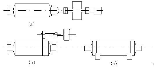 1、中心傳動。由卸料端經(jīng)空心軸直接與減速機出軸聯(lián)接,由電動機帶動,傳動軸的中心與簡體中心線一致(圖2中a)。